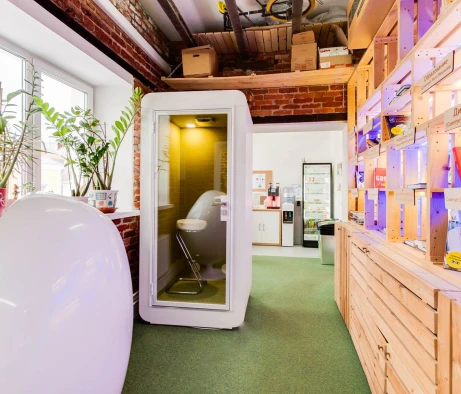 Высококачественные материалы и внимание к деталям обеспечили высокий уровень шумоизоляции, что крайне важно для комфортной работы в условиях офиса. Каждая кабина оснащена всем необходимым для удобства сотрудников: розетками, USB-портами, разъёмами Type-C, встроенным столиком и удобными местами для сидения. Для поддержания комфортного микроклимата предусмотрена система вентиляции, что позволяет использовать кабины продолжительное время без потери комфорта.